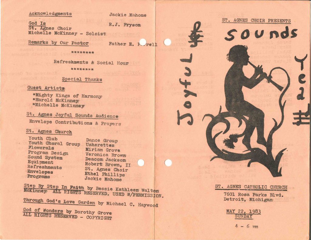 Abstract: The Jacqueline Mahome Church Music and Manuscripts chronicle two decades of Black religious life in Detroit through programs for services and choral concerts, mass schedules, church bulletins, and sheet music. The bulk of the collection is made up of programs for services at Detroit-area Christian churches including Detroit Unity Temple, Good Shepherd Lutheran Church, Cathedral of Most Blessed Sacrament, and St. Agnes Catholic Church, where Mahome was choral director in the 1980s. These programs, along with the flyers and bulletins that accompany them, are annotated with handwritten notes by Mahome and other churchgoers, offering a glimpse into the vibrant community of Black Christians in Detroit throughout the late 20th century.
