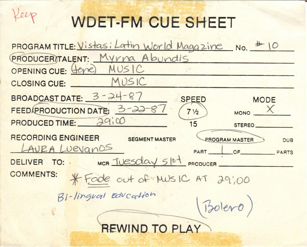 Abstract: Vistas: Latin World Magazine was a radio program produced by Myrna Abundis for WDET in the 1980s. Vistas covered a variety of topics related to the Latin world and issues affecting the Latin American diaspora community. Examples of topics covered in the collection include flamenco music, Latin American foods, mental health, bilingual education, AIDS, and folklore of Latin America. The collection includes various ¼” reel-to-reel tapes of the show along with their corresponding cue sheets. Also currently present in the collection is a small assemblage of commercially-produced 45s related to Detroit music. In the future these will enter DSC’s music library.